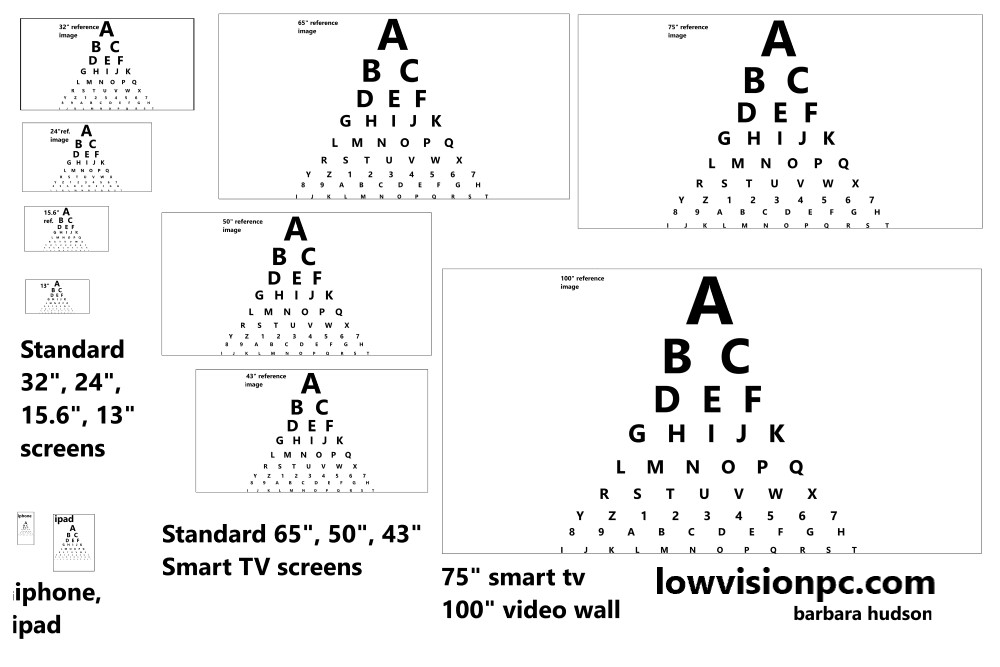 When you're low vision, there are plenty of computer-related tasks where a phone, a tablet, or a "normal-sized" screen isn't enough. The chart above shows different size screens showing the same "eye chart" scaled to different devices, from phones and tablets to regular-sized displays to the biggest screens normally available. It clearly illustrates how "the bigger the screen, the better" applies for low vision users. Imagine trying to understand the chart when you can only see a 1/5 x 1/5 portion (4%) at a time when using a screen magnifier set to 5x and scrolling back and forth ... There are a few obvious and well-known problems with screen magnifiers: |