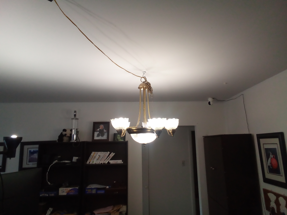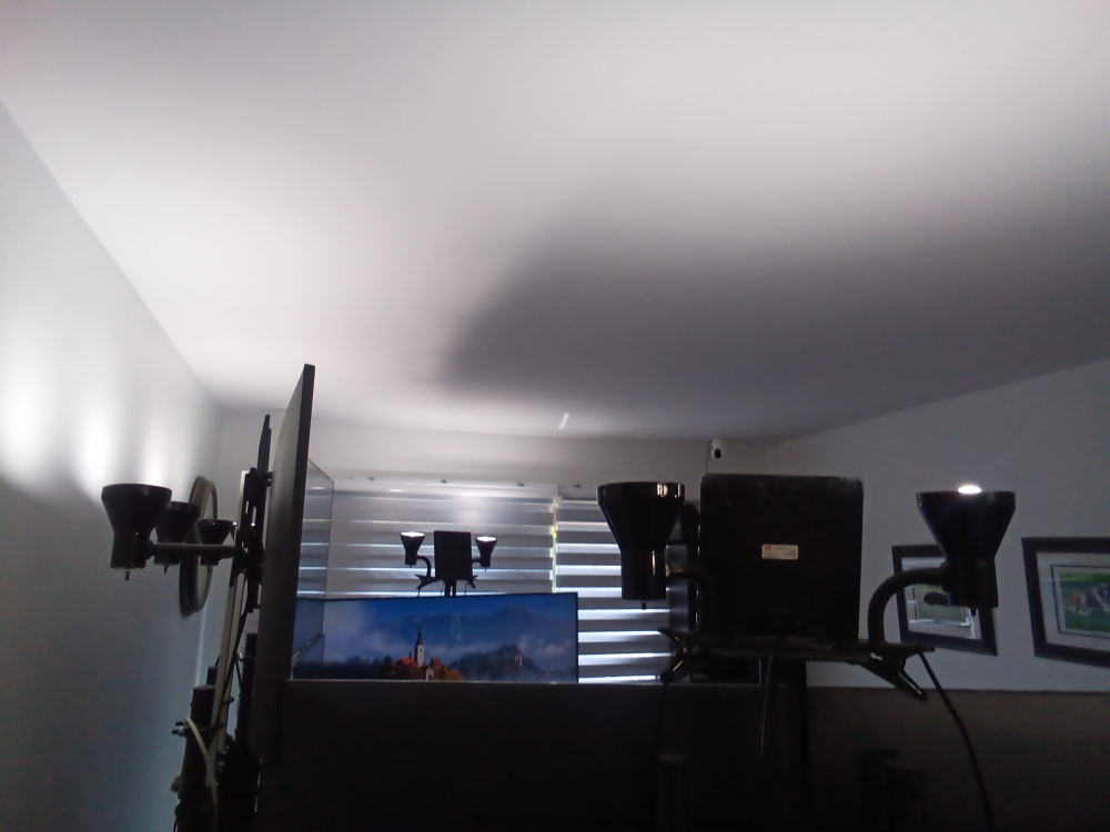 Lighting where you can directly see the bulb is not pleasant. The solution is to either use a globe or shade so you don't see the actual bulb, or to bounce the light off another surface, preferably the ceiling. By looking at the ceiling, you can also see the location of any darker areas that might need more light fixtures. As you can see from the first picture,the area directly above the work area is well lit, and lots of glare-free light is being reflected back down. The 8 x 15-watt daylight LEDs (first photo), 4 behind or above the 100" video wall, and 4 mounted atop the two 65" side screens, all reflecting off the ceiling, do a great job illuminating the work area. The rest of the room can use lamps, chandeliers, etc., to provde "fill" lighting, again with no direct views of bare bulbs. You'll know when you have enough lighting when you're no longer having a hard time seeing stuff that you couldn't see "in the darkness". This means not struggling to find TV remotes, markers, pens, keys, USB sticks, or trying to read papers on your work table. Bonus - Enough Daylight LEDs Helps Combat Depression People with low vision certainly have reason to be depressed, what with the everyday problems, and the additional problems finding a job, the social isolation, etc. Some people with depression spend hours every day staring into a "light box" that puts out lots of light. Why not just turn your home into a "light box"? This way, you don't lose several hours a day just sitting staring into a box at nothing. |